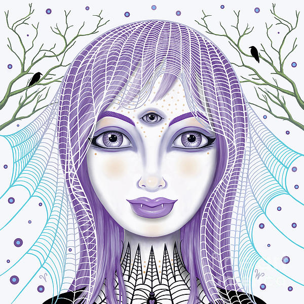 Queen duvet cover (88" x 88") featuring the image "Insect Girl, Spiderella - Sq.White" by Valerie White. Our soft microfiber duvet covers are hand sewn and include a hidden zipper for easy washing and assembly. Your selected image is printed on the top surface with a soft white surface underneath. All duvet covers are machine washable with cold water and a mild detergent.